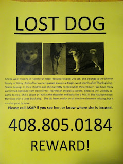 Shiba went missing Dec. 1 after Julie Nagel, a close friend of the Shimeks who lives in Gilroy and was temporarily watching the two pets, brought Shiba to work Dec. 1 because the un-neutered dog was in heat and restless. Nagel works as a dental hygenist in Hollister.